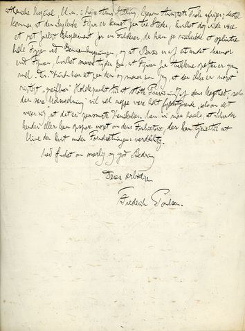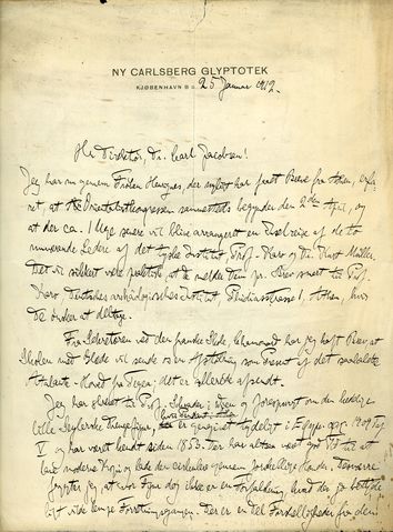 Jeg har skrevet til Prof. Schrader i Wien og forespurgt om den kedelige lille Seylerske Drengefigur, hvis Pendent i Athen er gengivet tydeligt i Efem. arx [græske bogstaver] 1909 Taf. og har været kendt siden 1853. Der har altsaa været god Tid til at lave moderne Kopi og lade den cirkulere gennem forskellige Hænder. Desværre frygter jeg, at vor Figur dog ikke er en Forfalskning, hvad der jo betydeligt vilde lempe Forretningsgangen. Der er en Del Forskelligheder fra den